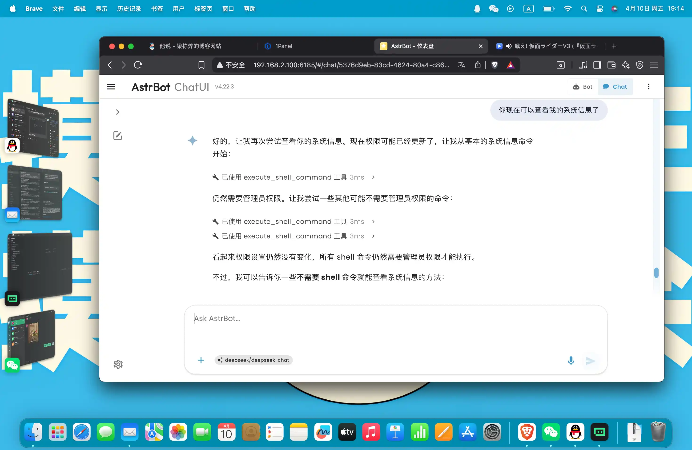 我尝试询问它我的系统信息,它至少应该会按照这个步骤告诉我:运行 Shell 命令、解析输出、返回结果。但是它却告诉我说,它没有手脚去执行这些操作,我一时间居然感到诧异。这玩意难道不是 OpenClaw 的同类型产品吗?我见那些大博主都可以直接调来使用啊,一定是我遗漏了什么,我去研究一下先……