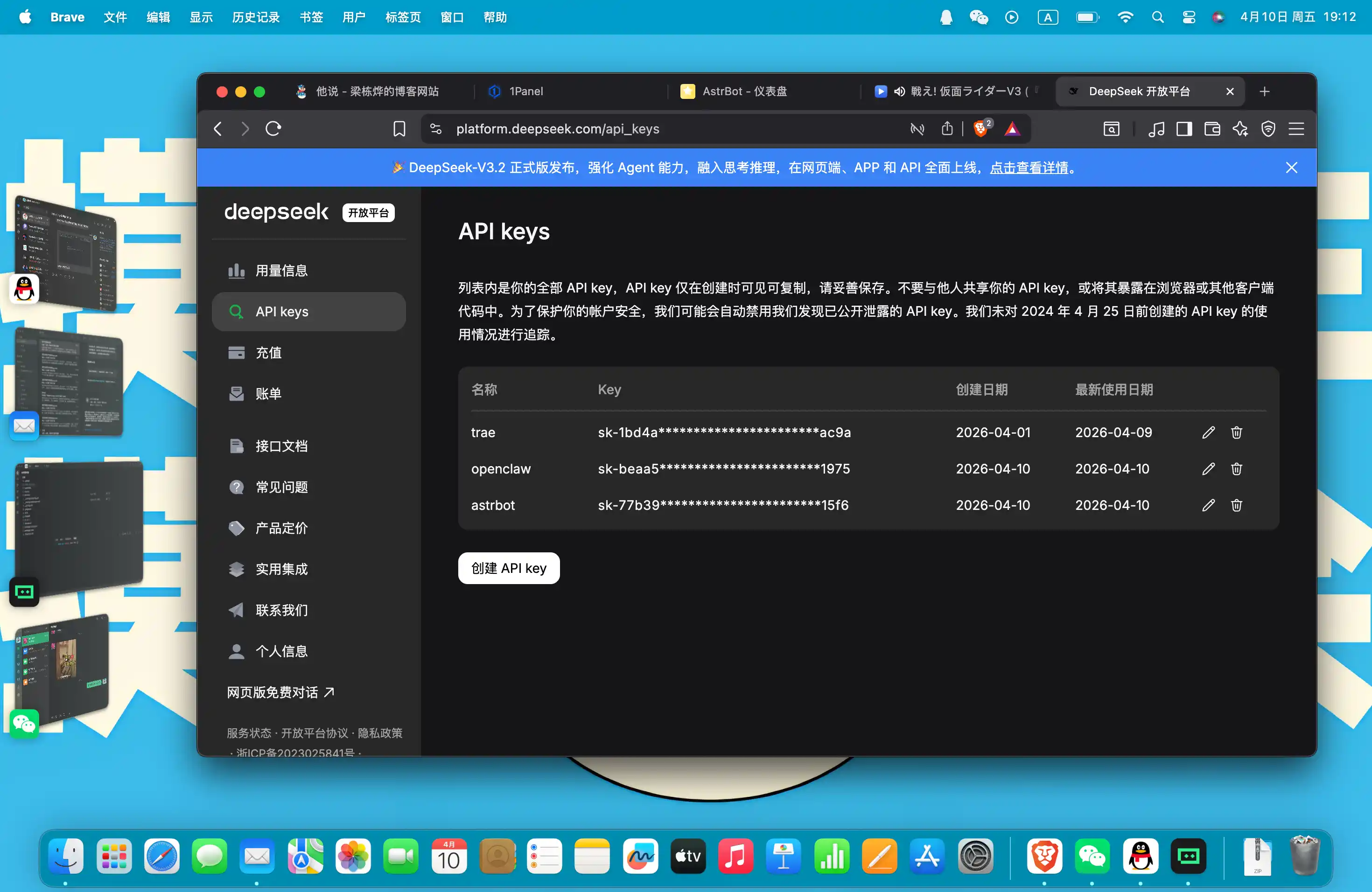 这里依旧是生成一个 API Key 用于 AstrBot 的调用。我觉得这是一个十分良好的习惯,不仅可以让我的大脑休息(毕竟密钥本来就不是拿来记得),还可以让攻击面最小化。如果大家都混用一个 Key,攻击者一旦破解,后续你想要逐个服务更换 Key 那可就太难了,维护成本又是一大问题。