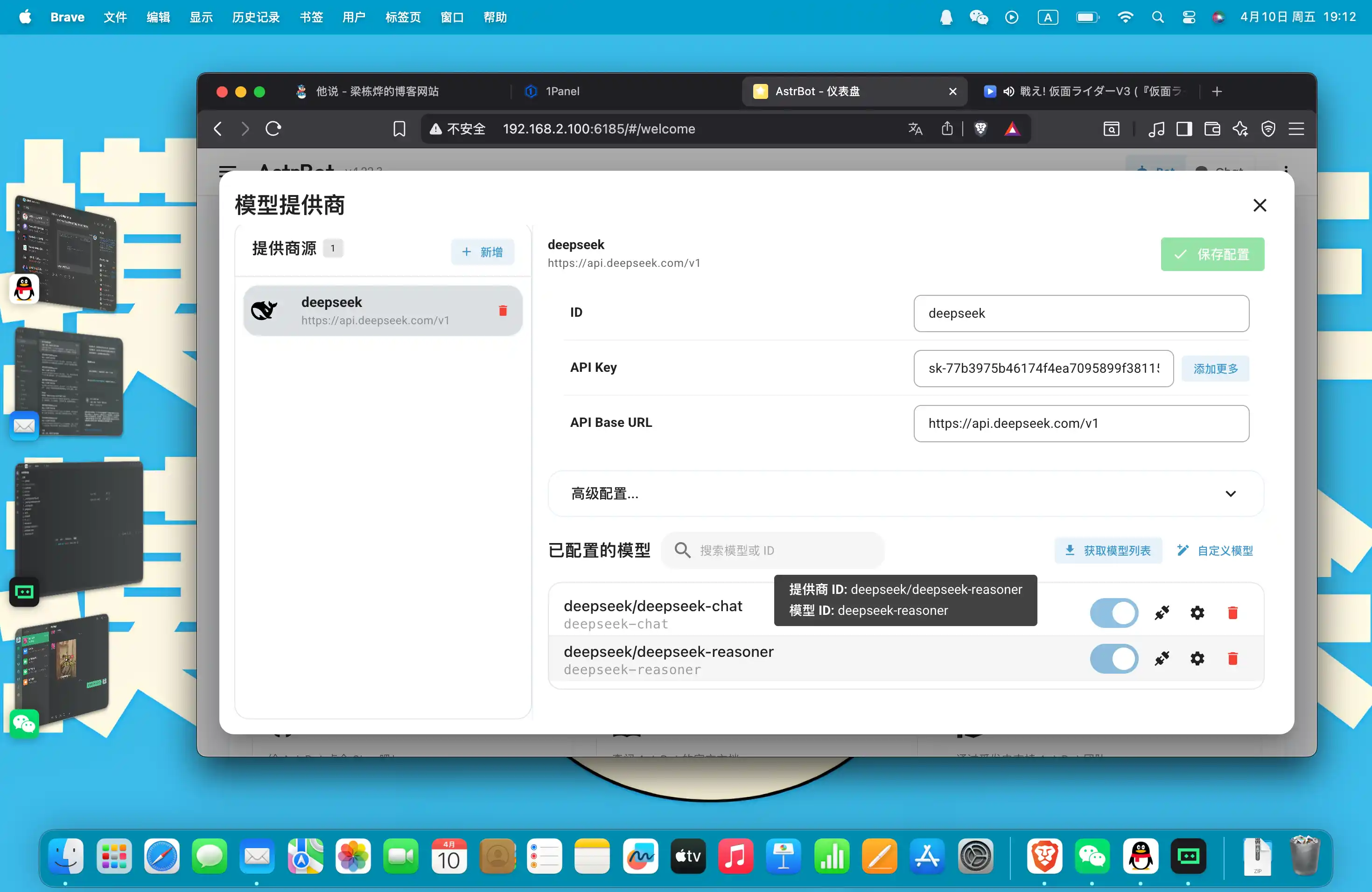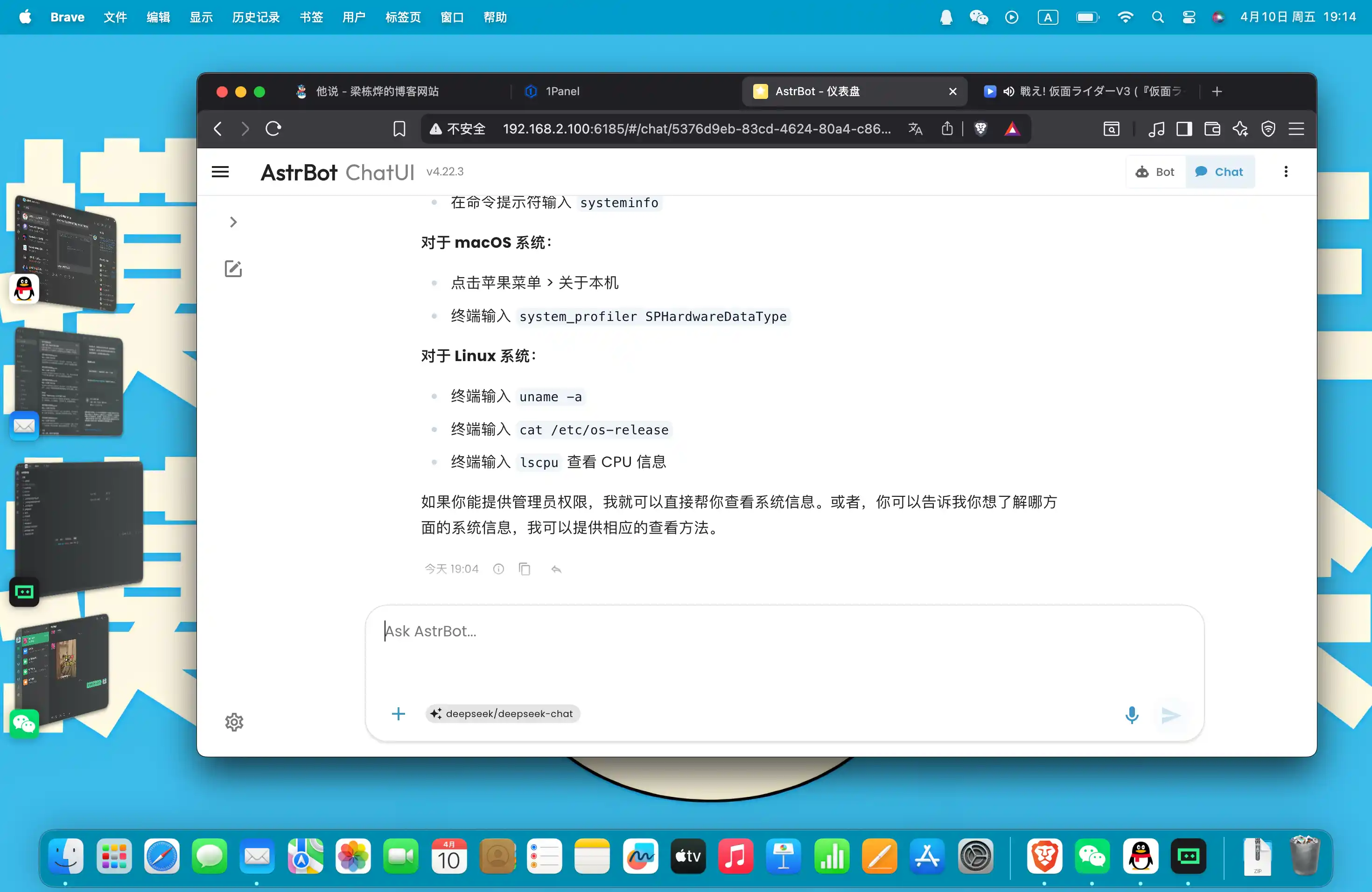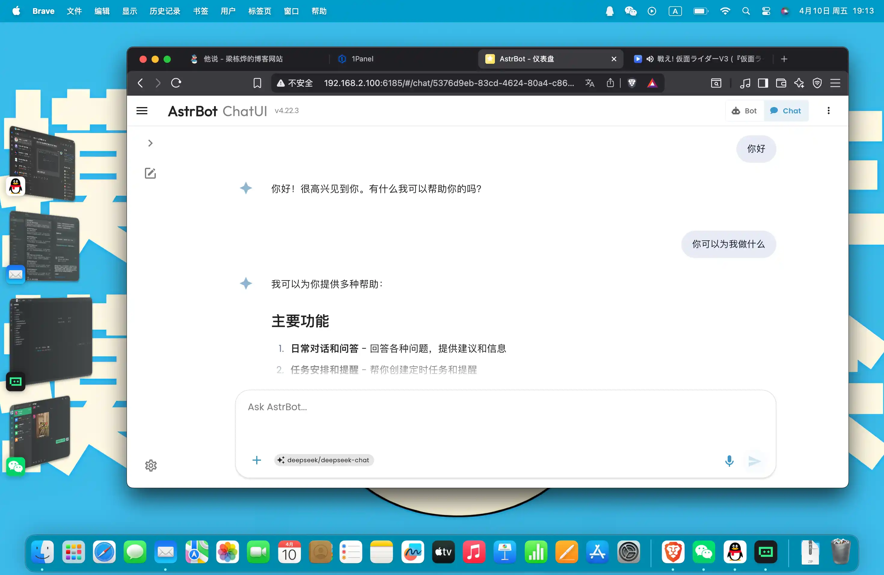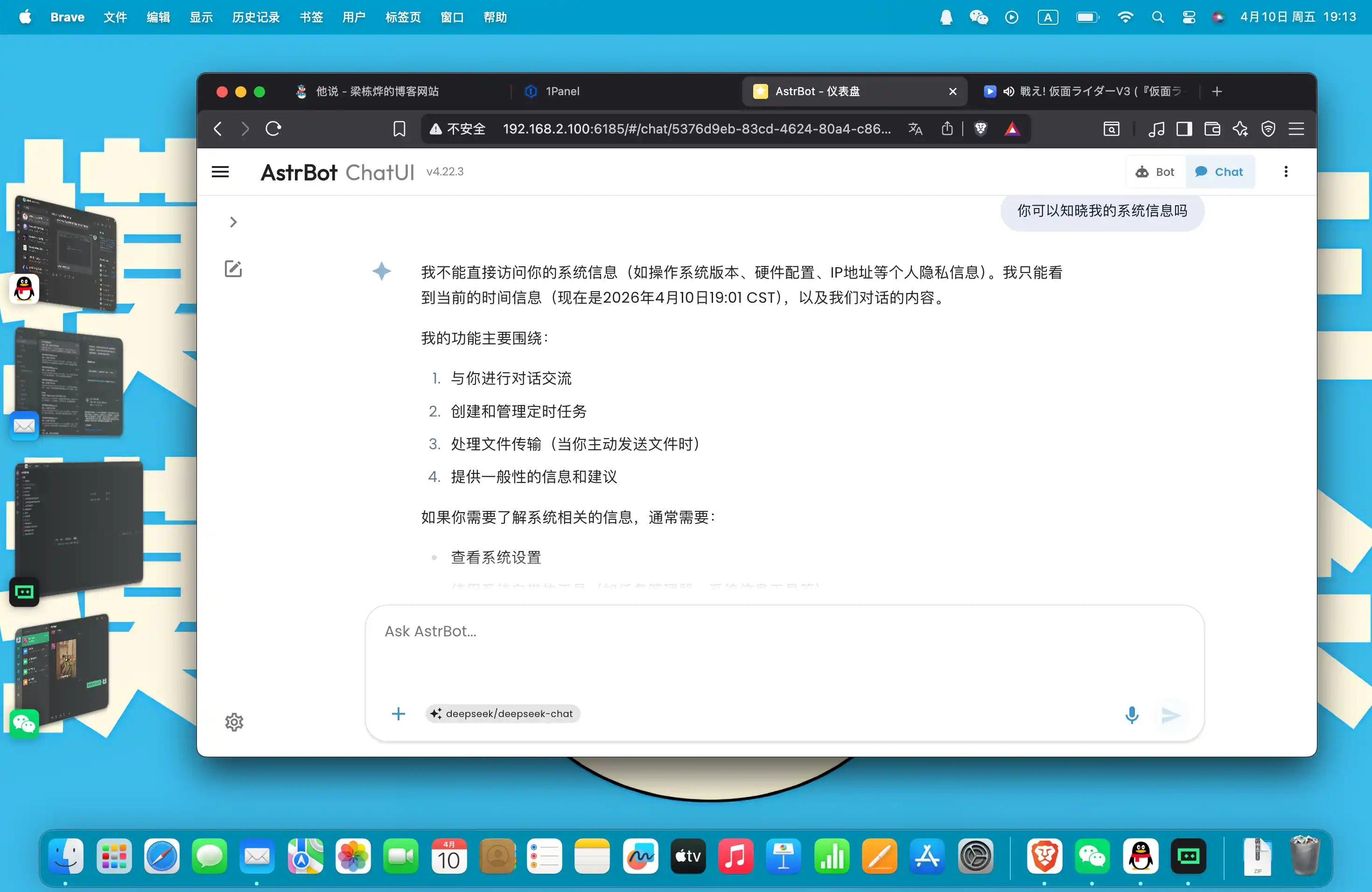 令我感到十分惊讶的是,这玩意的对话居然如此地快而流畅。之前我在 OpenWebUI 导入了 DeepSeek 的服务商密钥,使用 DeepSeek 时总是会卡一会,包括在 OpenClaw 里也是稍微卡一会才会响应。我觉得这不仅有 AstrBot 的功劳,还有我下午整顿网线的问题,多方面因素共同造就了这番成果。但是谁在乎呢?