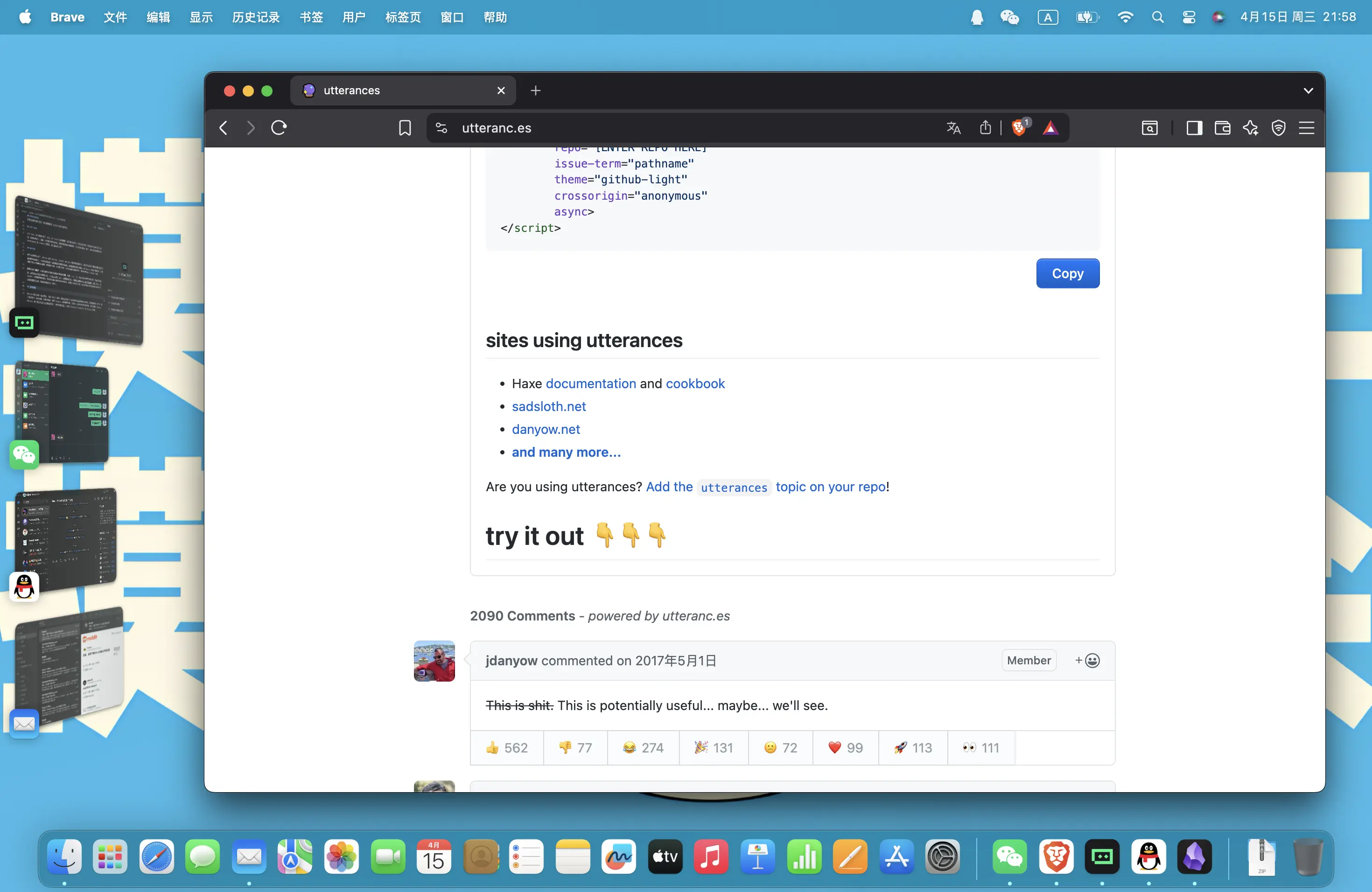 首先是 Giscus,我对这玩意的印象就是简单。他使用 GitHub Discussions 存储评论,这样就有几个好处,你不需要准备服务器,不需要准备数据库,不需要研究什么评论邮件通知,你只需要去 Giscus 的官网,按照那个中文文档,搞搞这、搞搞那,你就配置好博客网站的评论区了。像是回复、表情包、点赞什么的都支持……对当时小小的老子来说,建站搞评论区简直易如反掌。