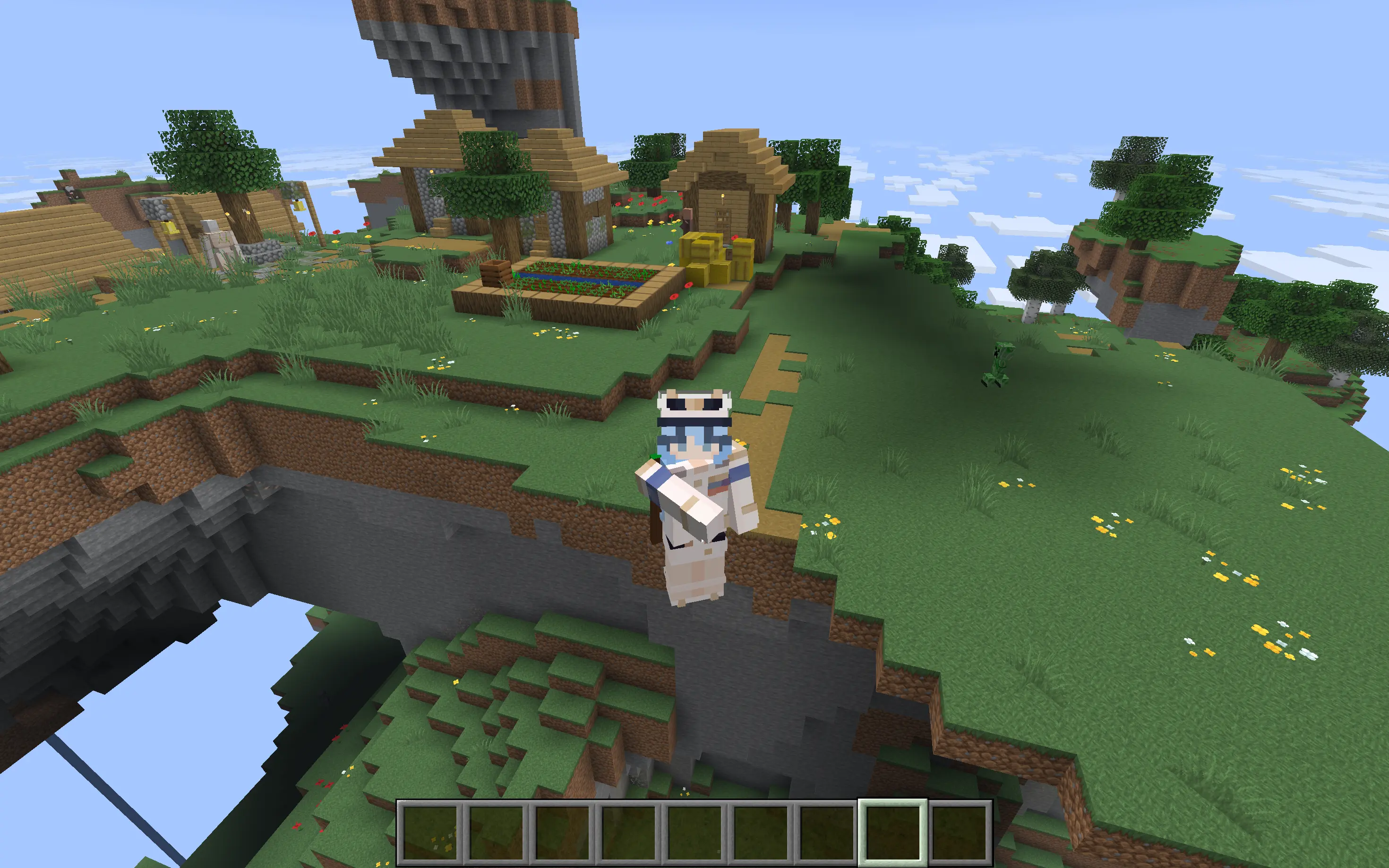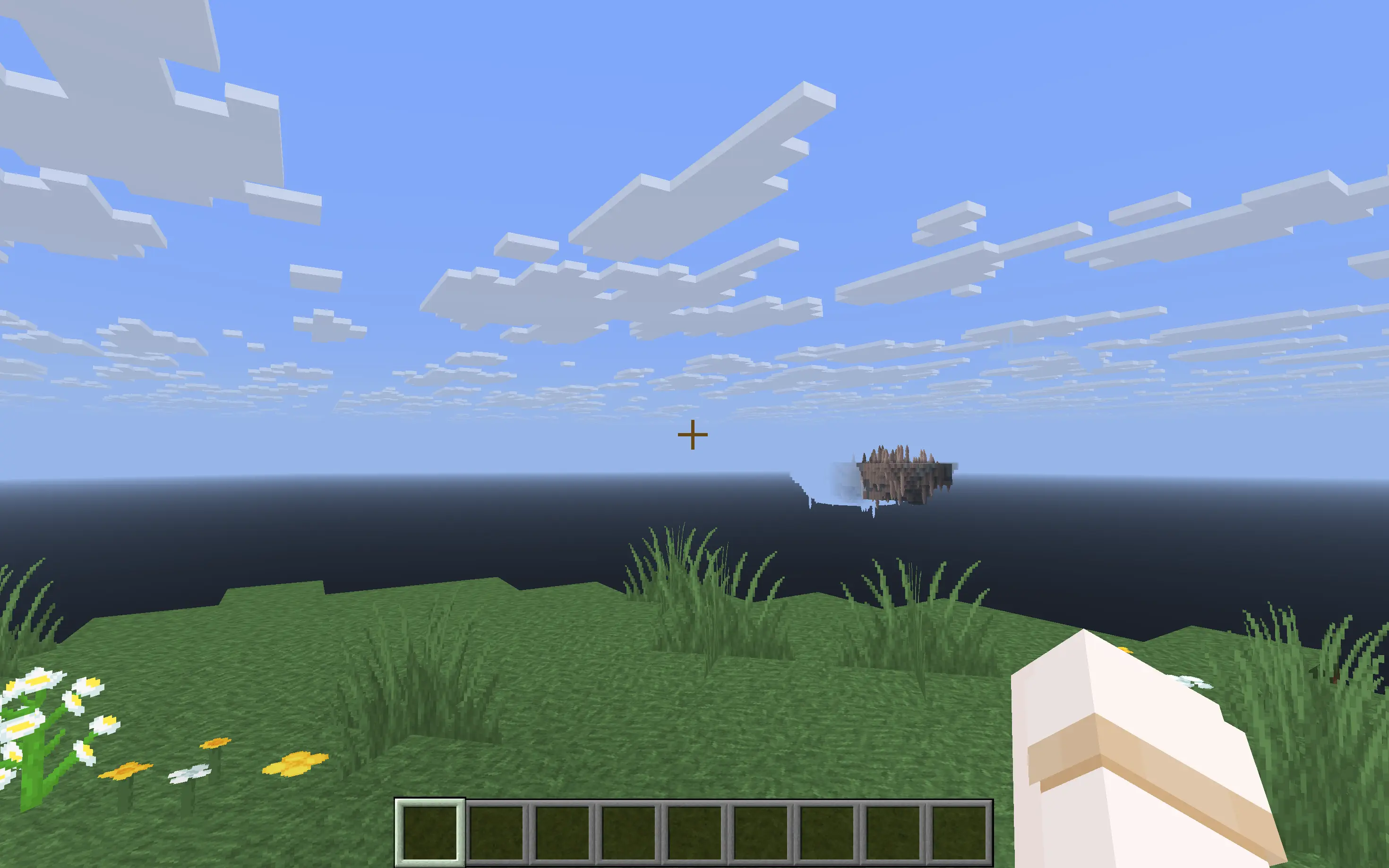 进入世界后,第一眼看到的场景确实让我有些失望,感觉就是个非常普通的浮岛地图。我们的出生点位于一座不算太大的岛屿上,岛上有一些基础的资源,远处的天空中也能看到另一座类似的岛屿。这样的景象似乎和我以前在游戏网站上随手下的那些空岛地图没什么区别,甚至可以说有些千篇一律,让人感觉缺乏新意。不过,既然选择了尝试这个数据包,我决定还是继续探索下去,看看是否有什么隐藏的惊喜等待着我。