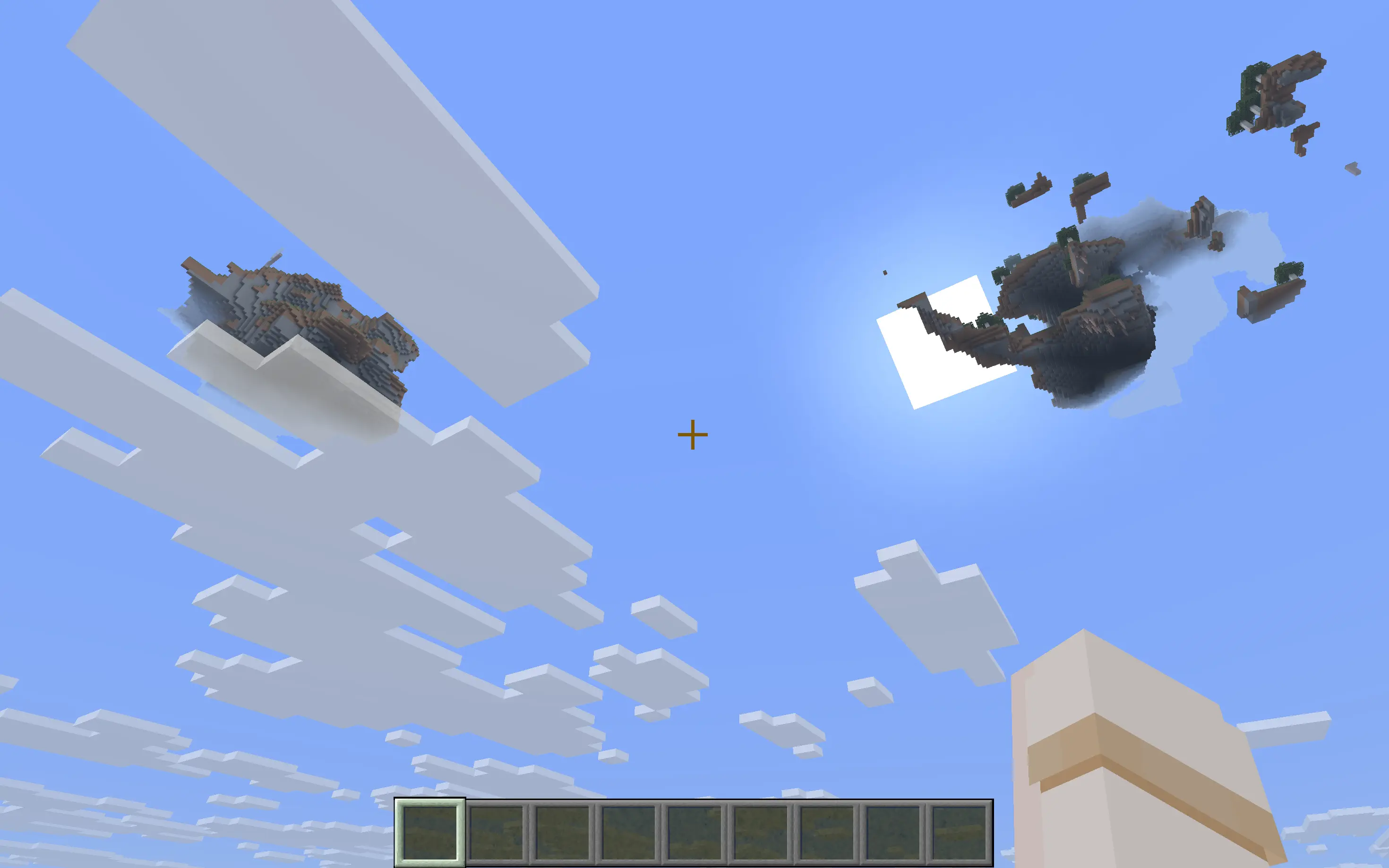 但当我不经意间转过身朝上面看时,眼前的景象瞬间让我惊呆了。哇哦,原来在云层的上面居然还有更多的空岛!这些岛屿悬浮在更高的天空中,在阳光的照射下显得格外神秘。我简直不敢相信自己的眼睛,连忙揉了揉眼睛再看,确认这不是幻觉。没错,这就是这个数据包最有意思的地方,它不仅仅在地面上生成浮岛,而是在不同的高度层次都创造了独特的岛屿世界。这种设计让整个游戏世界变得更加立体,也大大增加了探索的乐趣,让我对接下来的冒险充满了期待。
