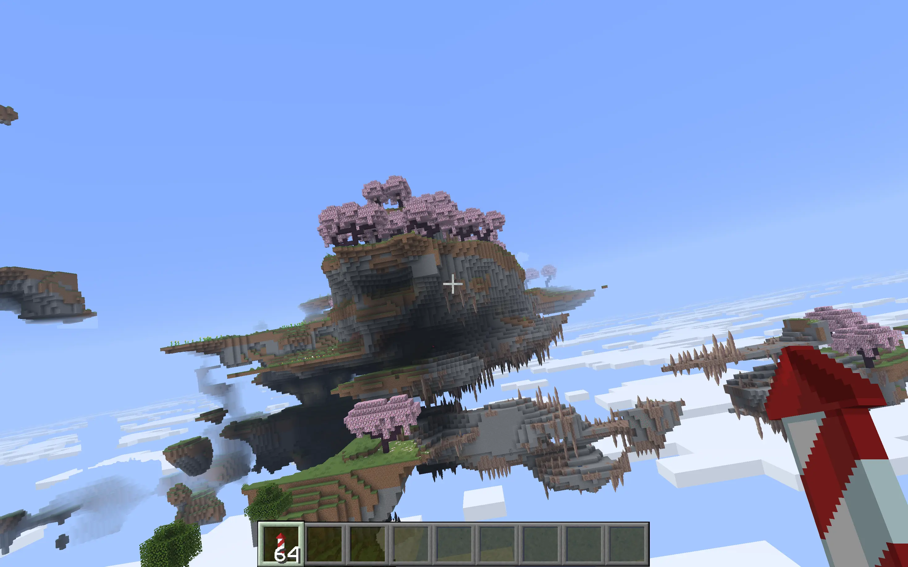 为了一探究竟,我从背包里拿出了一个鞘翅,搭配之前存档里存放的烟花火箭,准备飞向更高的天空。随着烟花火箭的助推,我逐渐上升,穿过了厚厚的云层,来到了更高的空域。远处的景象让我叹为观止:一座覆盖着樱花树林的浮岛静静地悬浮在天空中,粉色的樱花花瓣随风飘落,仿佛置身于童话世界。周围的云朵环绕着这座岛屿,阳光透过云层洒在岛上,营造出一种梦幻般的仙境氛围。这种感觉真的太奇妙了,让我不禁想起了那些描绘仙境的童话故事,而我现在就像是故事中的主角,正在探索这个神秘的空中世界。