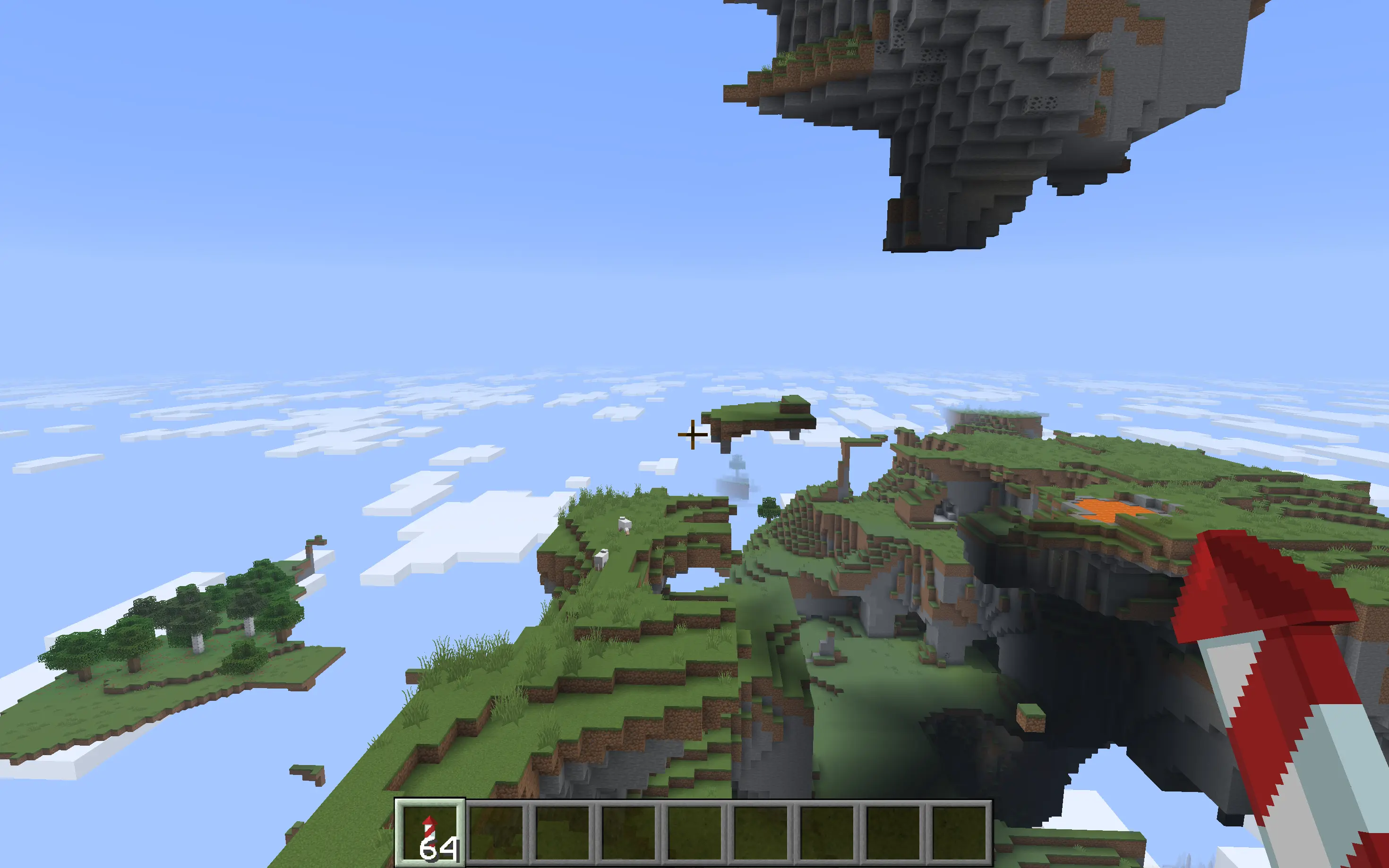 告别了樱花岛和石林岛,我又飞到了另一座岛屿。这座岛屿与之前的两座截然不同,这里没有樱花的浪漫,也没有石林的壮观,就是一片非常普通的平原。岛上的草地上有两只大肥羊在悠闲地吃草,它们看起来非常满足,完全没有意识到有陌生人的到来。在岛屿的隔壁,我还看到了一处露天岩浆,岩浆池不断地冒着气泡,散发出炽热的气息。而树木则生长在另一座相邻的小岛上,形成了一种独特的景观布局。看着这些悠闲的肥羊,我突然冒出一个奇怪的想法:如果我把这里的羊吃了,会不会获得特殊的能力,比如像这些岛屿一样飞起来呢?当然,这只是一个玩笑,但也让我对这个充满想象力的世界更加着迷。