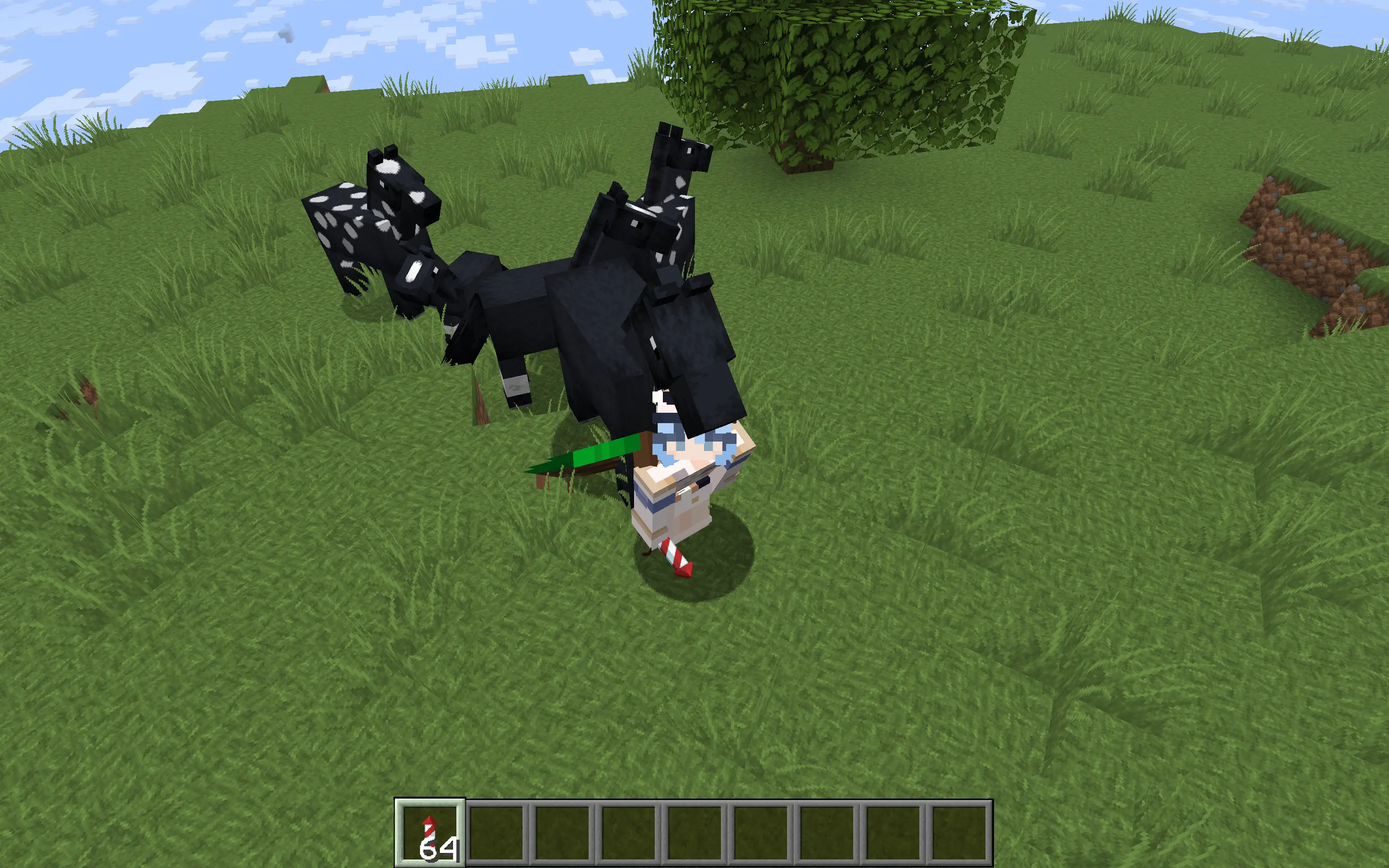 离开危险的洞穴后,我又来到了另外一座岛屿。这座岛屿上生活着一群非常特别的黑马,它们在岛上自由地奔跑,显得非常有活力。我仔细数了数,一共有四只黑马,它们的体型和毛色都非常相似,应该是一家人。看着这些在天上岛屿上生活的黑马,我突然冒出一个有趣的问题:这群生活在天上的黑马会不会编程呢?当然,这只是一个玩笑话,但也反映了这个空岛世界的神奇之处,连马匹都能在这样的环境中生存。这些黑马看起来非常健康,它们在岛上吃草、奔跑,完全适应了这种空中生活。我不禁想象,如果这些马会飞的话,那它们就真的成为了“天马”,可以在各个空岛之间自由穿梭,那该是多么有趣的景象啊!